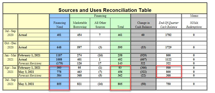 - During the April - June 2021 quarter,Treasury expects to borrow $463 billion in privately- held net marketable debt, assuming an end-of-June cash balance of $800 billion.The borrowing estimate is $368 billion higher than announced in February 2021, primarily due to the government’s additional response to the COVID-19 pandemic.