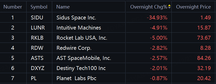Space stocks pulled back with Sidus Space down 35%; LUNR, RKLB down 5% each; Redwire down nearly 3%.