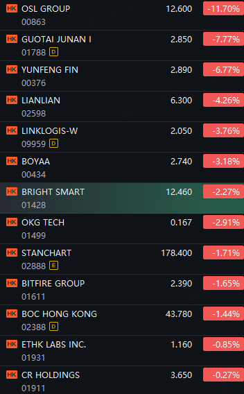 HK Crypto Stocks Fall; OSL Group down 12%; Guotai Junan down 8%; Yunfeng Fin down 7%; Lianlian down 4%; Linklogis and Boyaa down 3%.