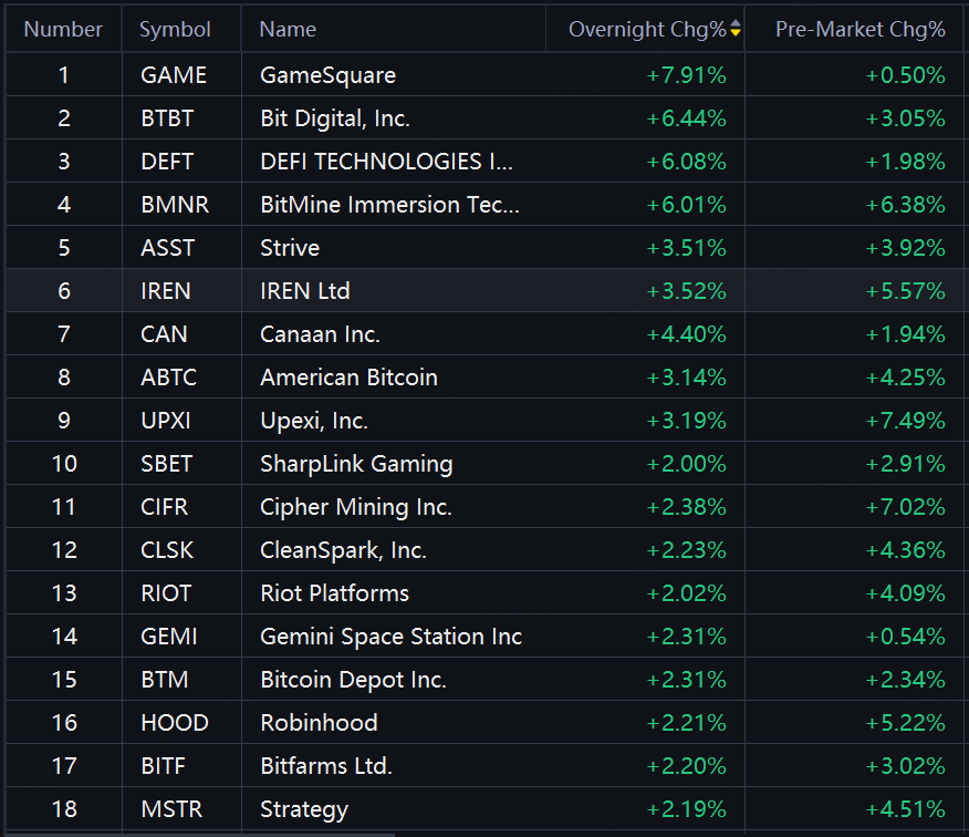GameSquare up 8%; Bit Digital, DeFi Tech, BitMine up over 6%; IREN, American Bitcoin, Upexi up over 3%.