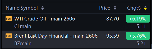 WTI crude oil futures rose 6.19% to $87.7 a barrel; Brent oil futures rose 5.76% to $95.59 a barrel.