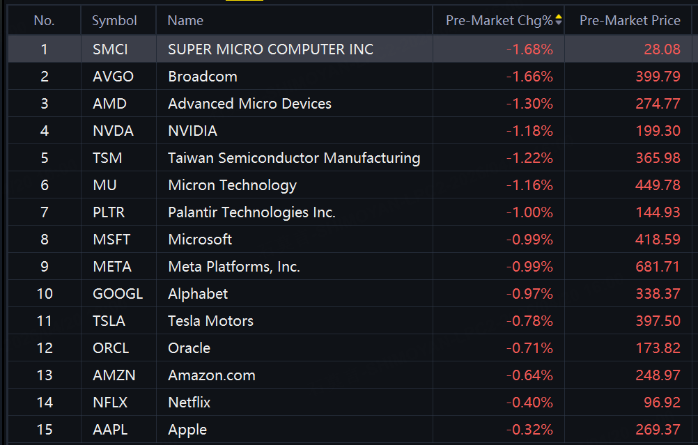 Big tech stocks fell in premarket trading. SMCI, Broadcom, AMD, Nvidia, TSMC, Micron, Palantir down over 1%.