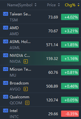 Major semiconductor stocks except for Intel jumped in morning trading; Taiwan Semiconductor Manufacturing rose over 4% while AMD rose over 3%.