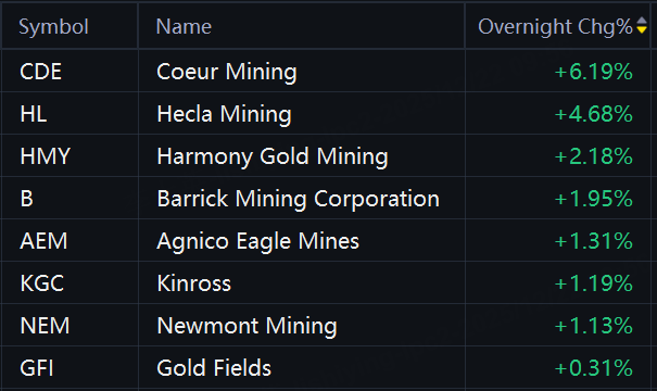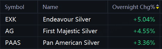 Gold and silver stocks jumped in overnight trading as spot silver and spot gold hit all-time highs. Coeur Mining rose 6%; Hecla Mining rose 5%; Harmony Gold Mining and Barrick Mining rose 2%. Endeavour Silver and First Majestic Silver rose 5%; Pan American Silver rose 3%.
