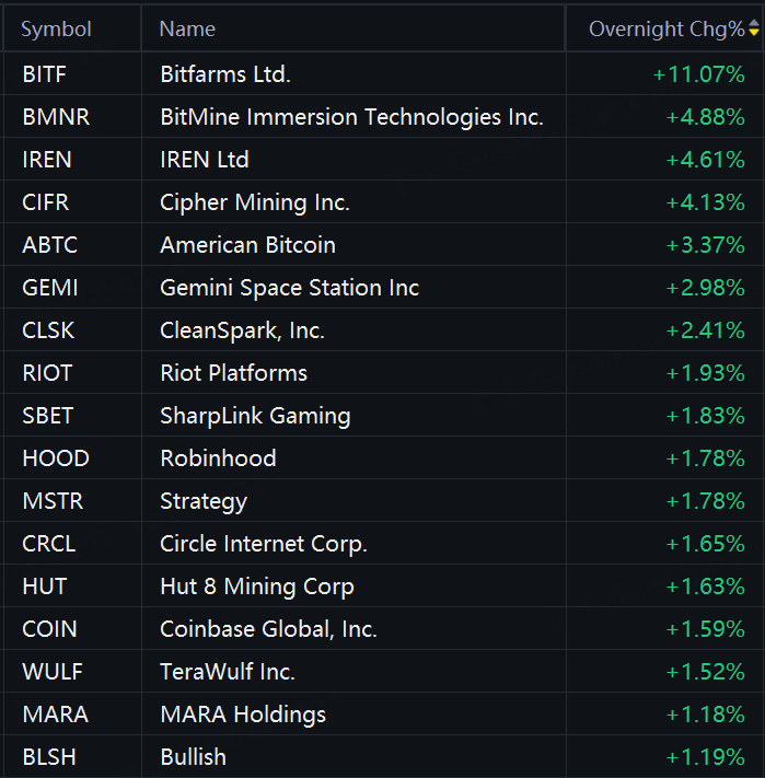 Crypto stocks jumped in overnight trading. Bitfarms rose 11%; BitMine and IREN rose 5%; Cipher Mining rose 4%; Robinhood, Coinbase, and Circle rose 2%;