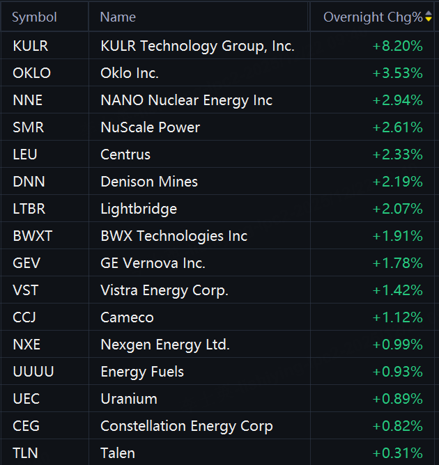 Nuclear energy stocks jmped in overnight trading. KULR Technology rose 8%; Oklo rose 4%; NANO Nuclear Energy and NuScale Power rose 3%; Centrus, Denison Mines, Lightbridge, BWX Technologies, and GE Vernova rose 2%.