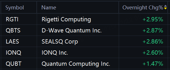 Quantum computing stocks gained in overnight trading. Rigetti Computing, D-Wave Quantum, SEALSQ, and IONQ rose about 3%.