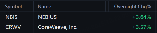 AI stocks also gained again in overnight trading. NEBIUS and CoreWeave rose 4%.