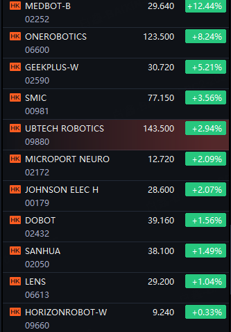 HK Robotics Stocks Jump. Medbot up 12%; Onerobotics up 8%; Geekplus up 5%; SMIC and Ubtech up 3%; Microport and Johnson Elec up 2%.