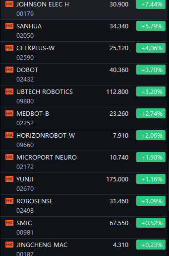 HK Robot Stocks Shined. Johnson Elec up 7%; Sanhua up 6%; Geekplus and Dobot up 4%; Ubtech Robotics up 3%; Medbot and HorizonRobot up 2%.