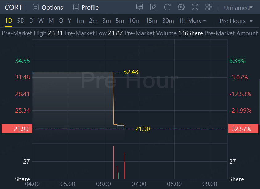 Corcept Therapeutics plummeted 32.6% in premarket trading Tuesday after a loss in a patent trial with Teva Pharmaceuticals over a patent for Cushing’s syndrome drug Korlym.
