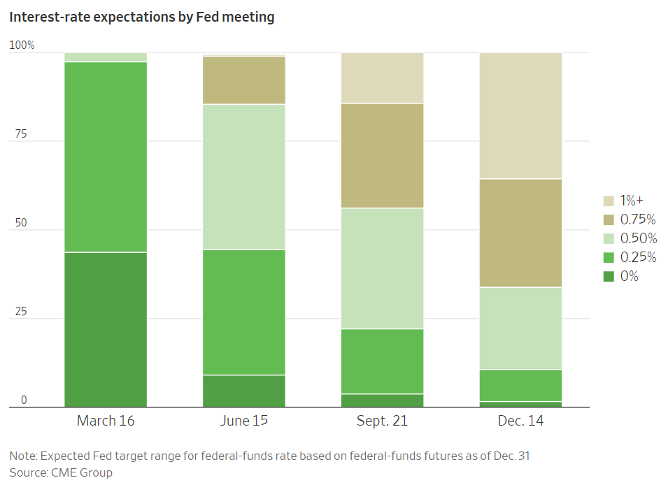 Such anxieties have been particularly evident in the bond market, where yields on longer-term U.S. Treasury bonds have remained stuck in a narrow range below 2% even as shorter-term yields have climbed—suggesting that investors are both worried about the economic outlook and confident that the Fed is going to raise rates around three times in 2022.