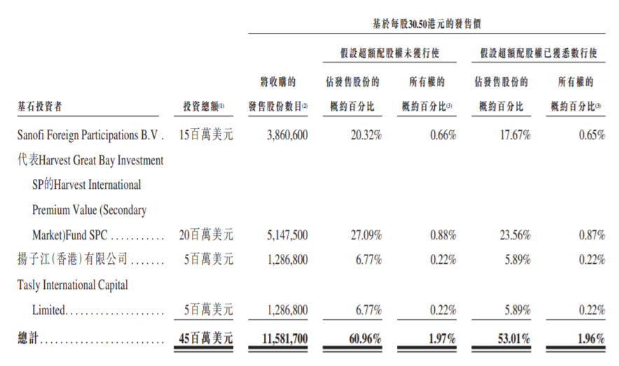 集团已签订基石投资协议,据此基石投资者已同意,在若干条件规限下认购或促使其指定实体认购相关数目的发售股份,该发售股份可按发售价购买,总额约为4500万美元(约3.53亿港元)。 基石投资者包括Sanofi Foreign Participations B.V、代表Harvest Great Bay Investment SP的Harvest International Premium Value (Secondary Market)Fund SPC、扬子江(香港)有限公司 、及Tasly International Capital Limited。