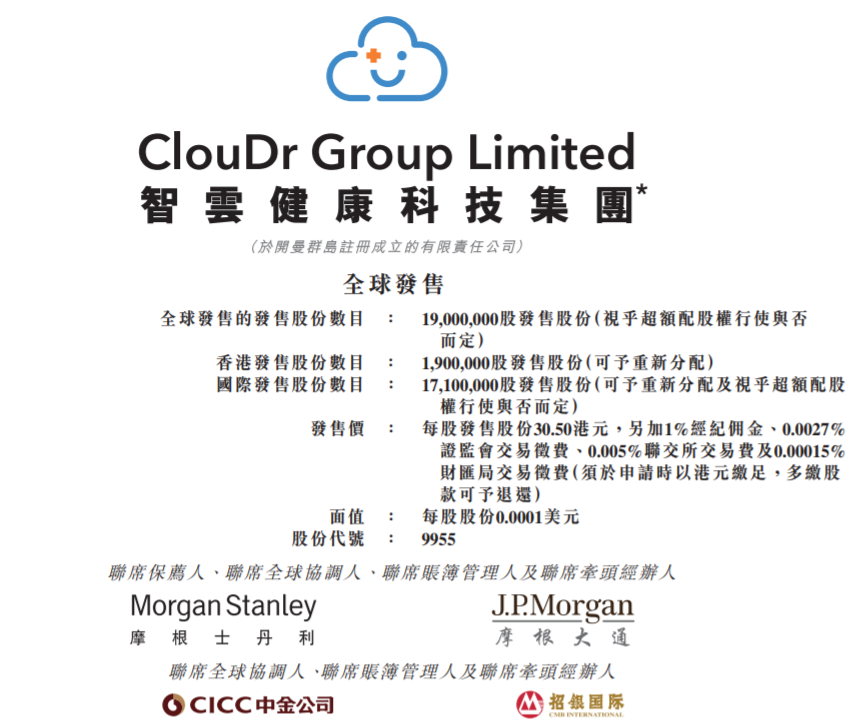 6月23日,智云健康发布公告,公司拟全球发售1900万股股份,其中香港发售股份190万股,国际发售股份1710万股,另有15%超额配股权;2022年6月23日至6月28日招股;发售价将为每股发售股份30.50港元,每手买卖单位100股,入场费约3081港元;摩根士丹利及摩根大通为联席保荐人;预期股份将于2022年7月6日于联交所主板挂牌上市。