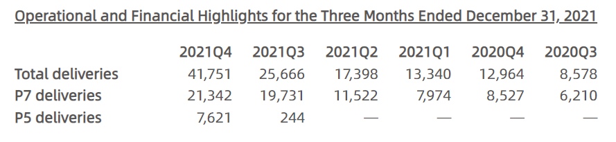 - Deliveries of the P7 smart sports sedanwere 21,342 in the fourth quarter of 2021, representing an increase of 150% from 8,527 in the corresponding period of 2020. The order for the P7 is continuing to gain momentum.