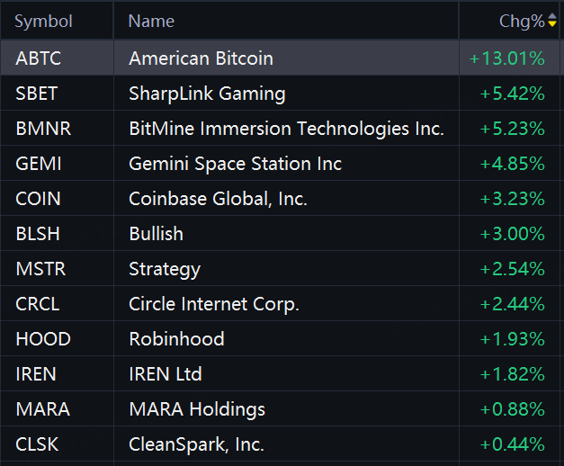 Crypto stocks rallied in morning trading. American Bitcoin rose 13%; SharpLink Gaming, BitMine, and Gemini rose 5%; Coinbase, Bullish, and Strategy rose 3%; Circle, Robinhood, and IREN rose 2%.