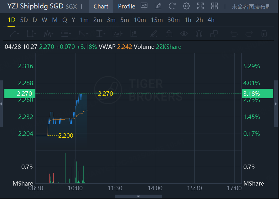 YZJ Shipbldg SGD jumps 3.18% at 10:44 am, Apr 28th.