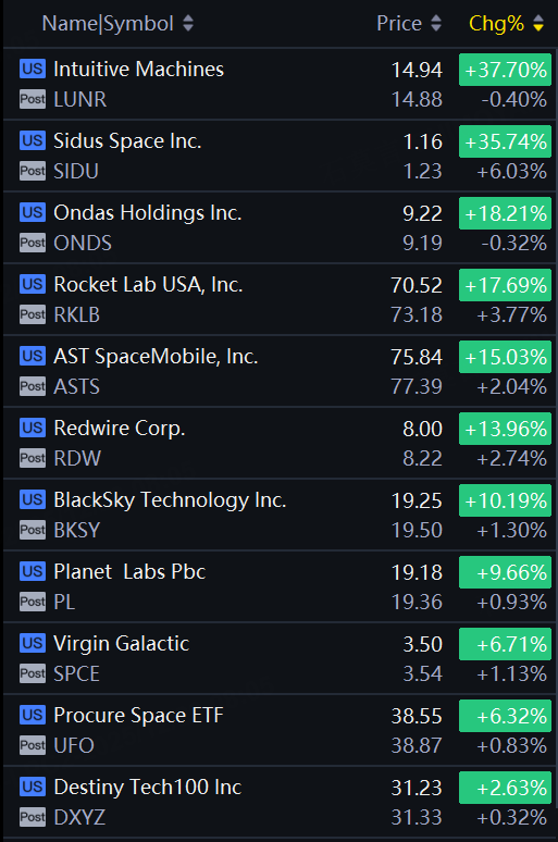 Space stocks rallied on Friday with LUNR up 38%, Sidus Space up 36%, Ondas Holdings, Rocket Lab up around 18%.