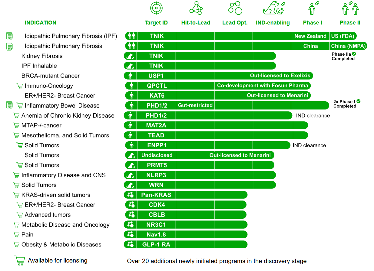 Insilico Medicine’s 31 programs, with 22 preclinical candidates nominated since 2021 and 10 IND-approved assets, all discovered using its Pharma.AI platform.