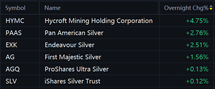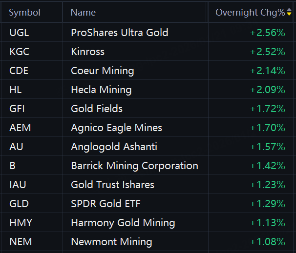 Gold, silver stocks and ETFs gained in overnight trading as spot gold topped $4,836. ProShares Ultra Gold and Kinross rose 3%; Coeur Mining, Hecla Mining, Gold Fields, Agnico Eagle Mines, and Anglogold Ashanti rose 2%; Barrick Mining, Gold Trust Ishares, SPDR Gold ETF, Harmony Gold, and Newmont Mining rose 1%.