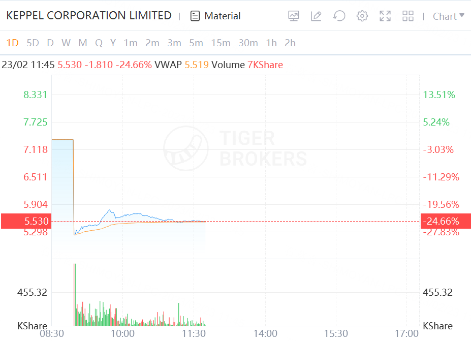 Keppel Corp was trading 24.66 per cent or S$1.81 lower at S$5.53.