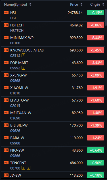 MiniMax down 8%; Pop Mart down 3%; Xiaomi, Li Auto down 2%; Alibaba, Meituan down 1%; Tencent up 0.5%.