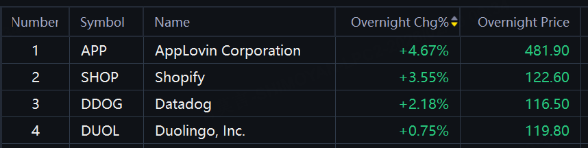 Some AI application software shares jumped in overnight trading. AppLovin up over 4%; Shopify up over 3%; Datadog up over 2%.