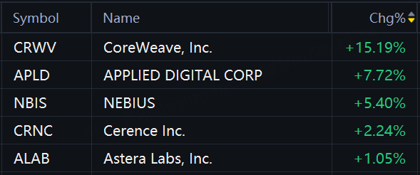Nvidia related stocks jumped in morning trading. CoreWeave rose 15%; Applied Digital rose 8%; NEBIUS rose 5%; Cerence rose 2%; Astera Labs rose 1%.