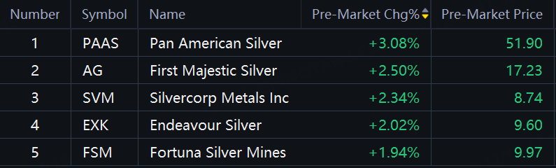 Silver stocks rose in premarket trading on Friday as Pan American Silver up 3%; First Majestic Silver, Silvercorp, Endeavour Silver up over 2%。