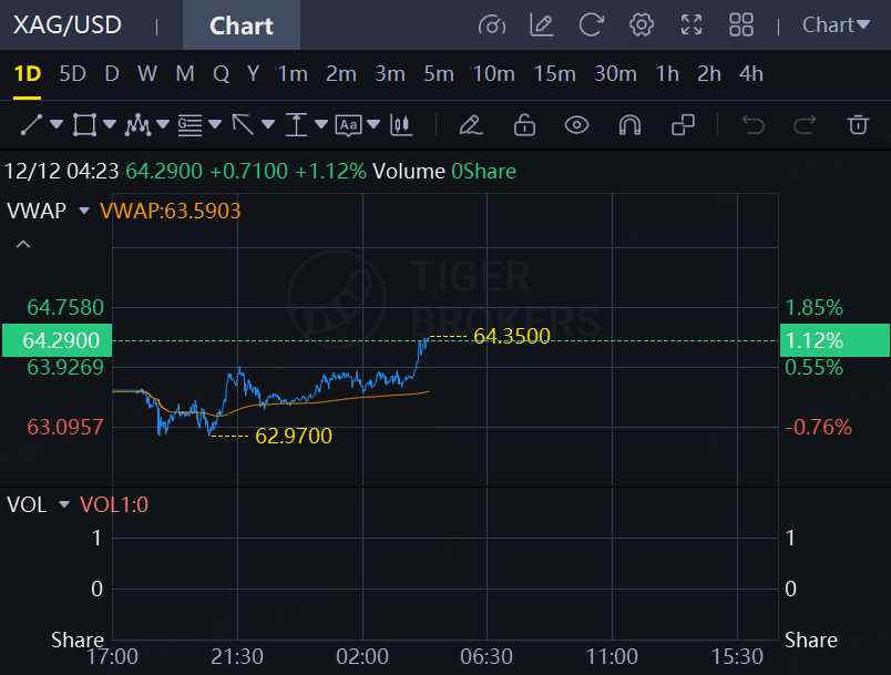 Spot silver rose to fresh record high of $64.35 per ounce.