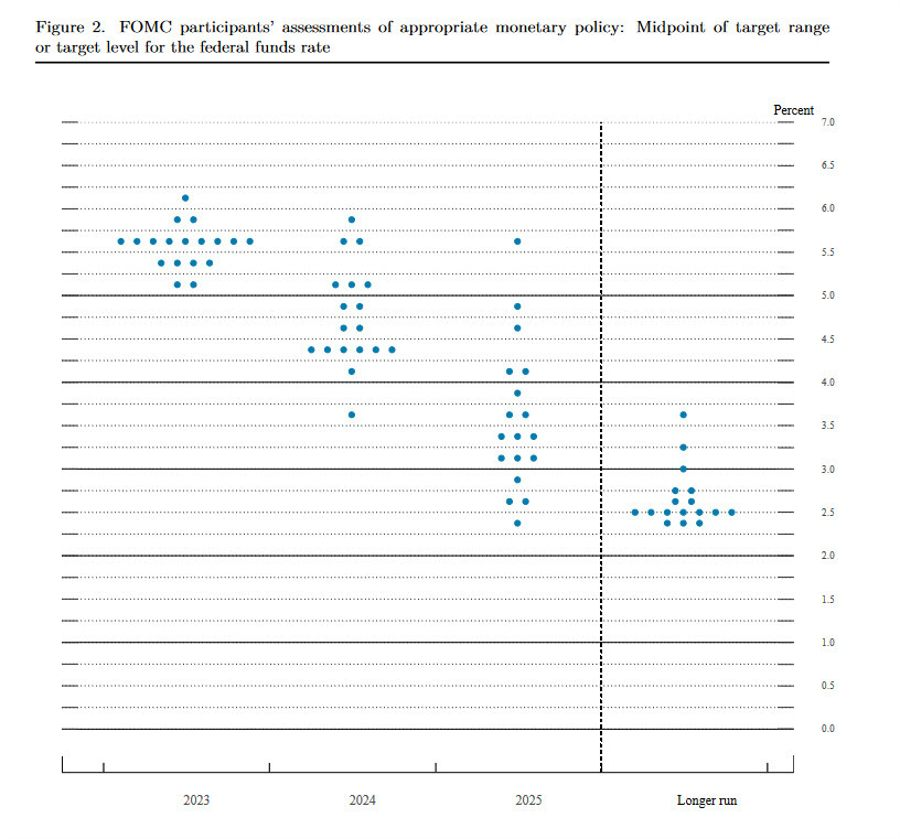 The dots moved decidedly upward, pushing the median expectation to a funds rate of 5.6% by the end of 2023. Assuming the committee moves in quarter-point increments, that would imply two more hikes over the remaining four meetings this year.