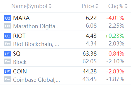 Marathon Digital, Riot Blockchain and Block fell over 2%; Coinbase slid 1.87%.