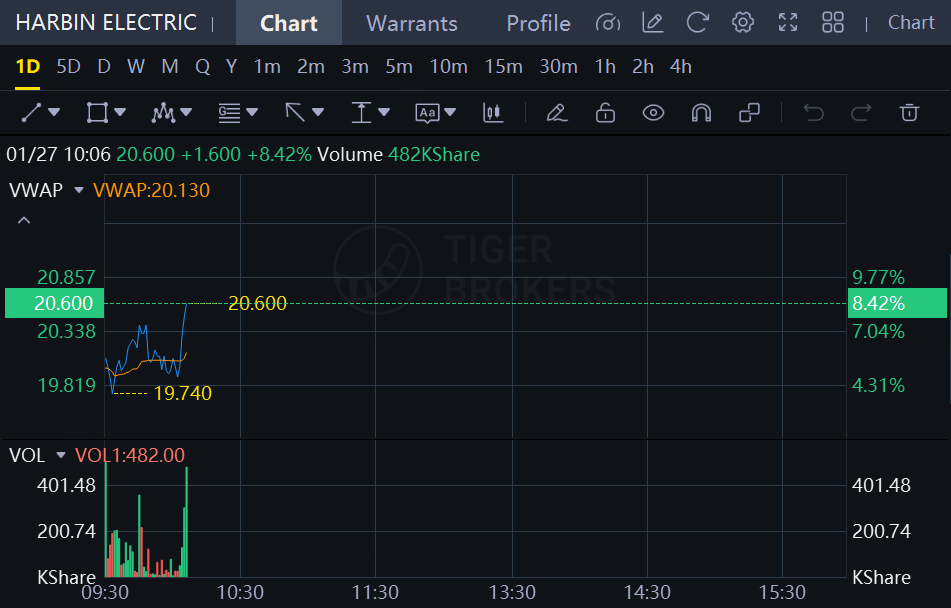 Harbin Electric stock jumps over 8% in Hong Kong trading. The company issued a positive profit alert after the bell yesterday, estimating that the net profit attributable to the owners of the parent company will have grown by around 57% YoY to around RMB2.65 billion in 2025, primarily owing to the growth in operating revenue and further improvement in product profitability during the year.