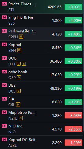 Singapore stocks opened flat on Wednesday. STI merely changed; Sing Inv up 4%; ParkwayLife up 1%; Mapletree PanAsia down 3%; Nio down 2%; Keppel DC down 1%.