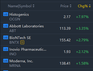 Vaccine stocks flew higher in morning trading, with Ocugen rising nearly 8% and Abbott rising over 3%.