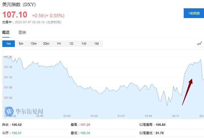 美元指数震荡上行,短线下破107.00后迅速重上107.00,逼近美股早盘时逼近107.30所创的2002年12月以来高位。