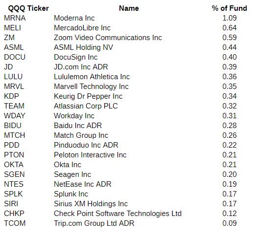 The first thing that leaps out from this list is how small an impact most of these stocks have on the total value of QQQ. Only Moderna(NASDAQ:MRNA)makes up more than 1% of the value of the ETF. There is almost 100 times more Apple(NASDAQ:AAPL)in QQQ than there is Sirius XM(NASDAQ:SIRI).