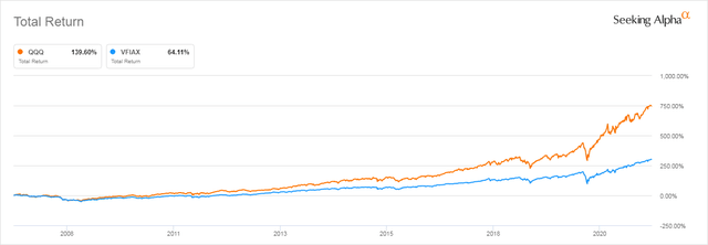 Total Return of QQQ and VFINX Since the Pre-Financial Crisis Peak