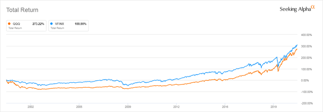 QQQ started trading in 1999. But the VOO ETF share class of Vanguard's 500 Index Fund did not begin trading until September of 2010, which is well after the two major market crashes that have occurred in the past two decades. Therefore, I am going to use the investors share class of the Vanguard 500 Index Fund(VFINX), which is just another share class of VOO, but was trading throughout the 1990s as a comparison to QQQ.