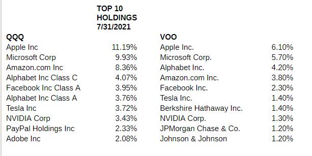 The top 10 stocks in VOO make up 28.60% of its entire value. The top 10 stocks in QQQ make up 52.82% of its value. (Data as of July 31, 2021).
