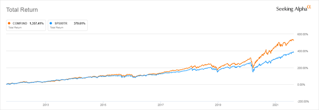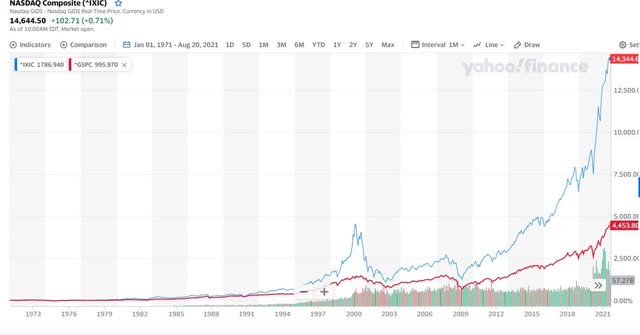 Though older investors will remember the Nasdaq's dramatic fall at the turn of this century, its dramatic rise before that collapse was strong enough that even with that collapse that it still equaled or outperformed the S&P 500 index at any time since its inception in 1971.
