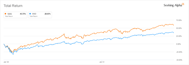 Total Return of QQQ and VOO Since the Pre-COVID-19 Peak