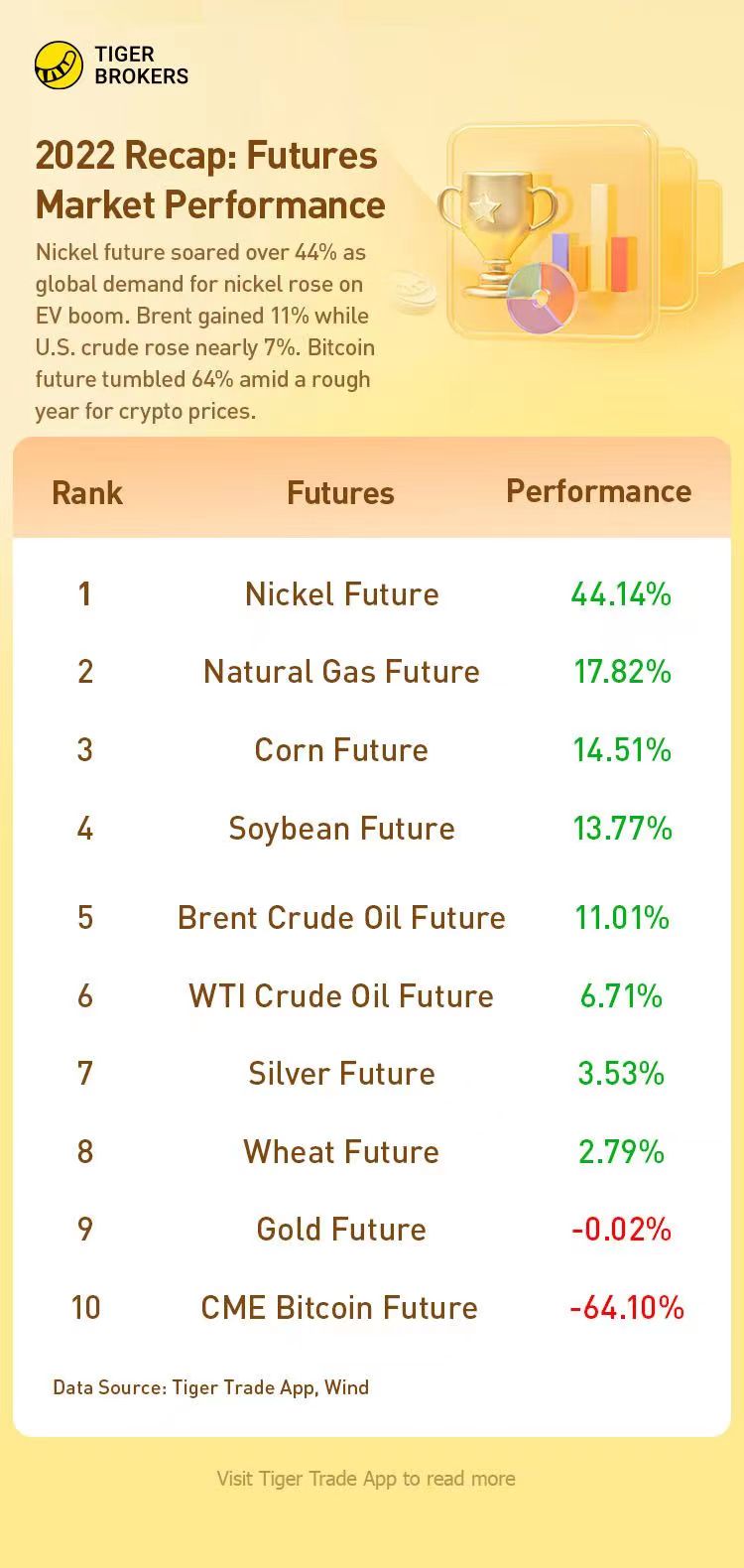 Nickel future soared over 44% as global demand for nickel rose on EV boom. Brent gained 11% while U.S. crude rose nearly 7%. Bitcoin future tumbled 64% amid a rough year for crypto prices.