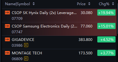 CSOP SK Hynix Daily 2x Leveraged Product up 20%; CSOP Samsung Electronics Daily 2x Leveraged Product up 15%; GigaDevice up 5%.
