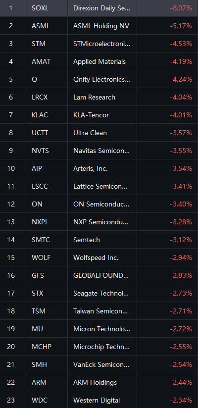 Chip Stocks Fall. SOXL Drops 8%; ASML Down 5%; STM, AMAT, Q, LRCX And KLAC Down 4%; On Semi Down 3%; Micron And TSMC Down Over 2%