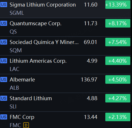 Lithium Stocks Jump. Sigma Lithium up 13%; Quantumscape up 8%; Sociedad Quimica Y Minera up 7%; Lithium Americas, Albemarle, Standard Lithium up 4%.