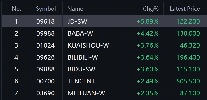 HK popular tech stocks kept rally. HSTECH Up 2%; JD up nearly 6%; Alibaba up over 4%; Kuaishou, Bilibili, Baidu up over 3%; Tencent, Meituan up over 2%.