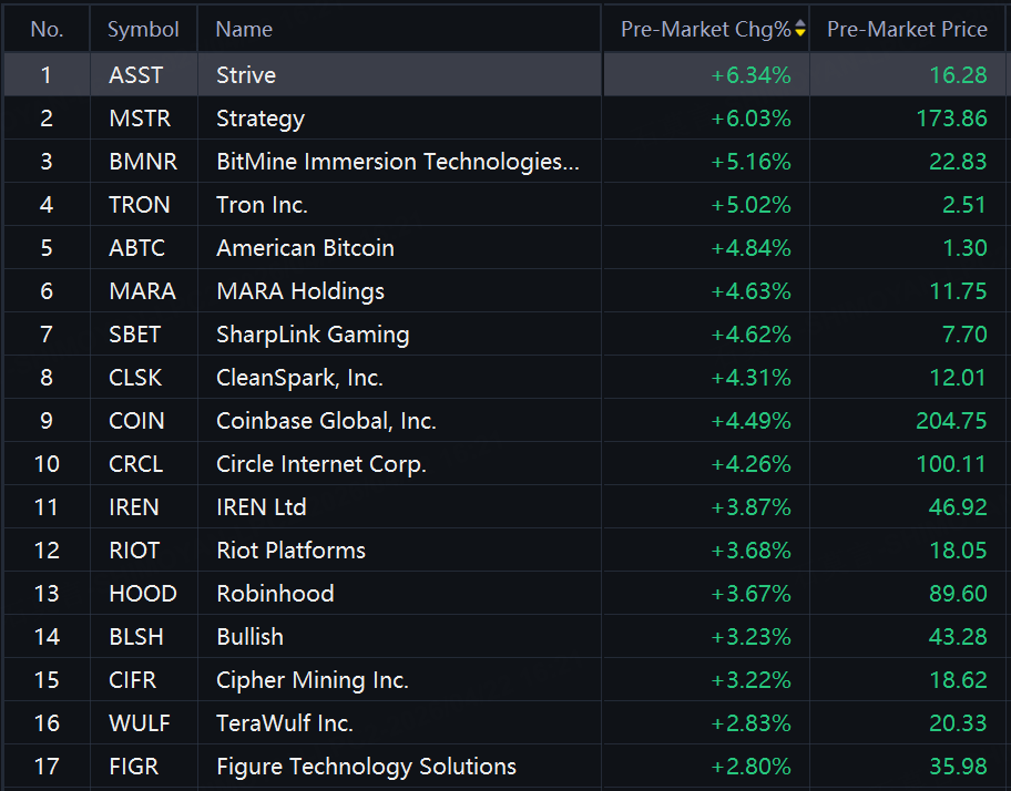 Crypto shares jumped in premarket trading. Strive, Strategy up 6%; BitMine, American Bitcoin up around 5%; MARA, SBET, Coinbase, Circle up over 4%.