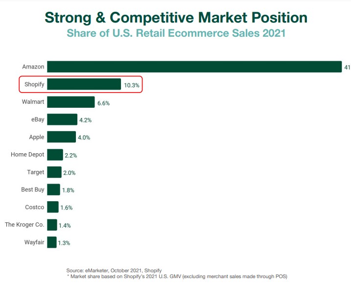 2021年在全美零售电子商务销售份额占比仅次于亚马逊