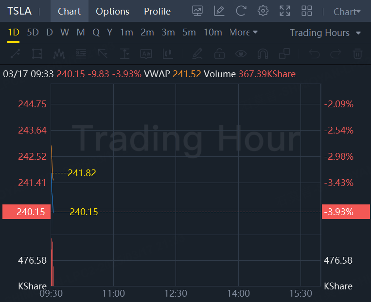 Tesla stock fell 4% in morning trading on Monday. Mizuho lowered the firm’s price target on Tesla to $430 from $515 and keeps an Outperform rating on the shares.